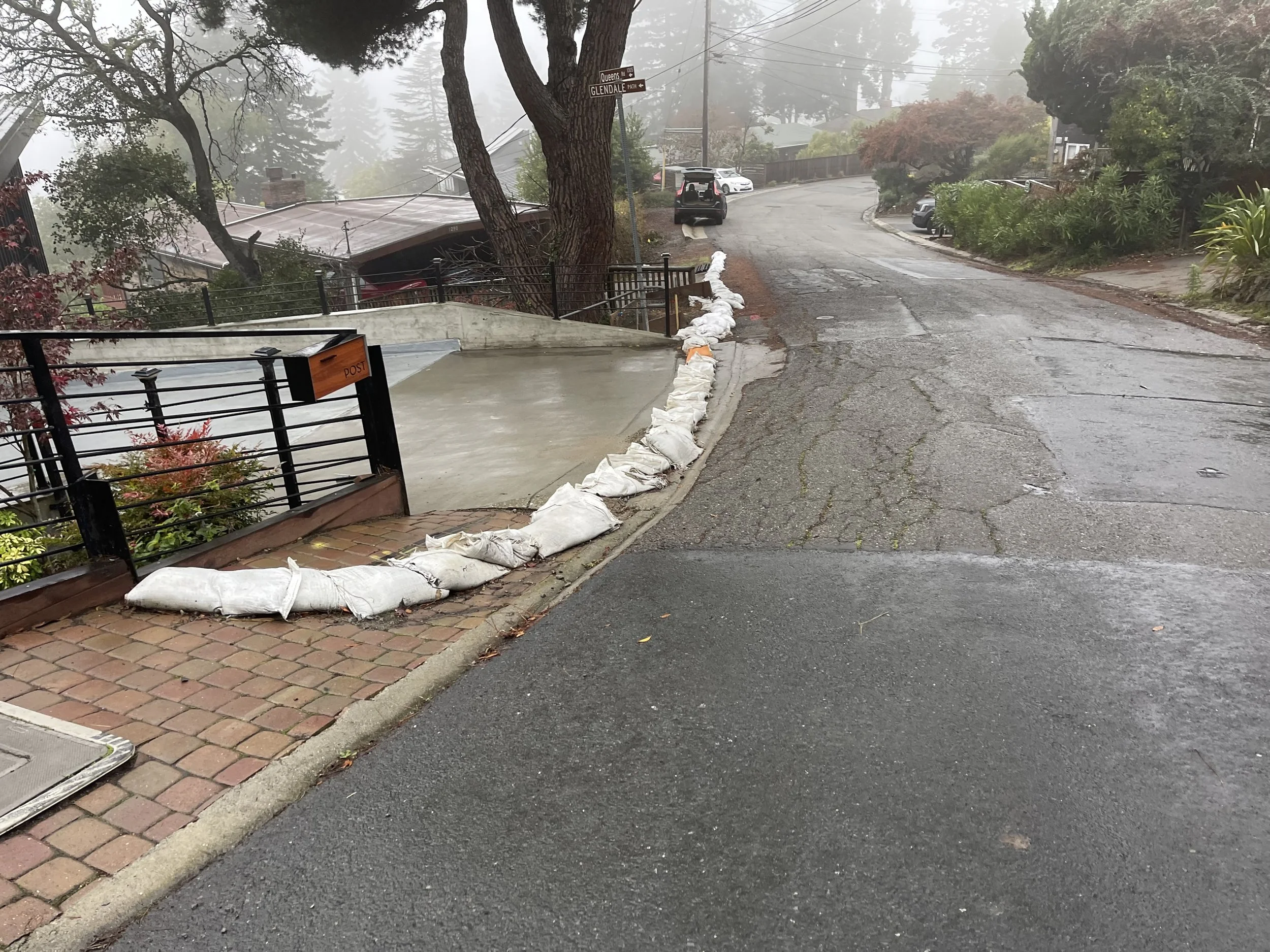 Bandaid solution: Sandbags in front of driveways and public path.